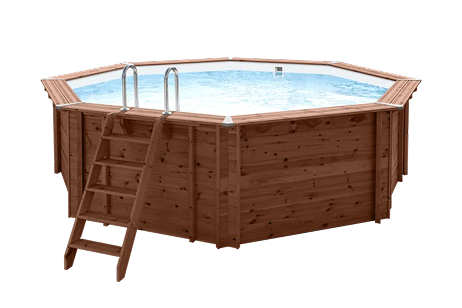 Het hout is speciaal behandeld tegen weer en wind. Daardoor blijft het zwembad mooi en stevig.